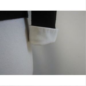 as a black grosgrain strip along the hem, and ivory sleeve cuffs, that look like they were not part of the original sweater and were added by previous owner.