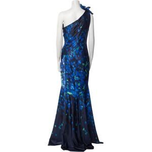 Command attention in this hard-to-find, sold-out, stunning Rene Ruiz Collection gown, brand new with tags. This elegant one-shoulder dress features a striking blue print with delicate ruffles and pleats for a show-stopping silhouette. Accented at the top of the shoulder is a large self-fabric flower appliqué—concealed Zip Closure at Back.