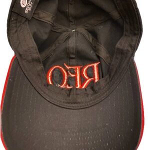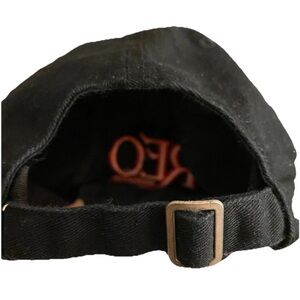 Fantastic REO Speedwagon ball cap. Black with band name embroidered in red. 100% cotton with back buckle to adjust size.