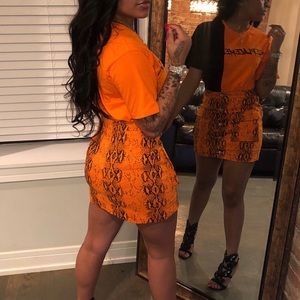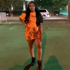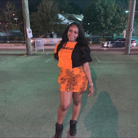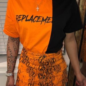 This is a shirt and skirt set. The shirt is black and orange with the words “replace me” written on it. The skirt is snake print and is equipped with pocket big enough to fit an iPhone and other handy things, yet barely noticeable. I wore this piece to a concert with a pair of Jordan’s. The shirt can easily be paired with a pair of olive green cargo jeans or black jeans also!