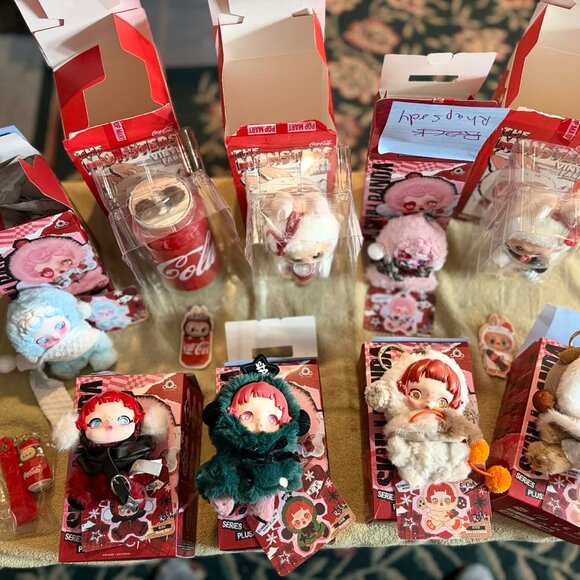 *9 Plush Keychain Dolls that are REPLICAS of popular collectibles (all have been opened to view and photograph the contents but then placed right back into packaging/boxes. All include boxes and interior packaging, most include REPLICA cards with names of pieces they are REPLICAS of.)