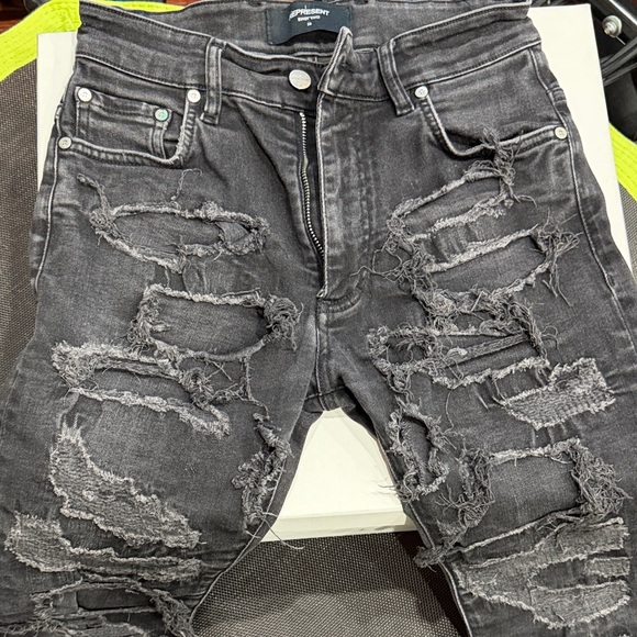 Represent- Trendy black jeans with a rugged ripped design. Perfect for a casual, edgy look.