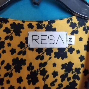 RESA Floral Wrap Mini Dress size Medium. Sold on Revolve. Mustard yellow with small black flowers. Deep V neck. Scrunched wrist bands. Tie faux wrap waist.
