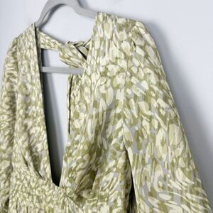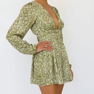 Gorgeous green printed romper by RESA. Deep plunge neckline. Elastic cuffs on a semi puff style sleeve. Open back with tie detail. Pockets. Back zipper closure on the shorts. Brand NWT. Women’s size large.