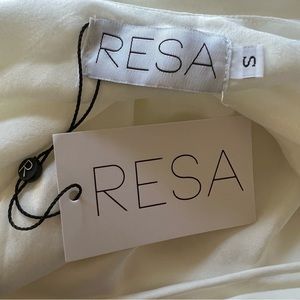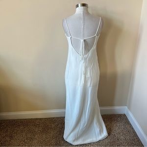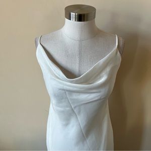 Elegant white dress by RESA. Features a sleek design with a side slit. Perfect for any occasion. Would be so cute for engagement party, rehearsal dinner, wedding or night out on honeymoon