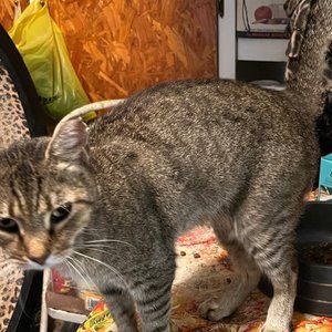 Tiger showed up at my home in 2017. He did not seem to be feral but very friendly. He was an intact male. I kept feeding him and he decided to stay. I believe he had been abandoned when his previous owners moved away. I sent him to be fixed and updated all his shots. He is till with me as of 2023. Such a big luv bug. He loves to be petted and wants to play. I have no idea how old he is but it really doesn't matter. He will stay at the cat ranch as long as he wants and will be taken great care of. He is a great mouser out here at the farm.
