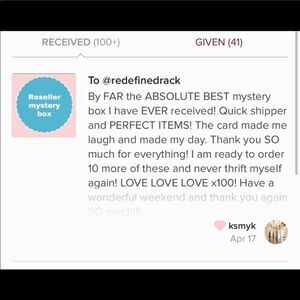RESELLER MYSTERY BUNDLE Great for Resellers All my items are New with Tags attached. NO MALL BRANDS. LARGE BOX 8-10 pieces (ALL NWT) (SEE LISTING FOR OTHER SIZED BUNDLES) Small 3-5 pieces (ALL NWT) Medium 6-8 pieces (ALL NWT) Brands and sizes vary. Bundles will include an assortment of the following: Jewelry Accessories Women’s Handbags Jeans Shoes (NEW IN BOX) Women’s Dresses Women’s Jeans Women’s Tops Women’s sports apparel Women’s Shorts Men’s Top’s Children’s Clothing