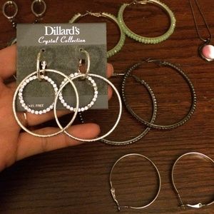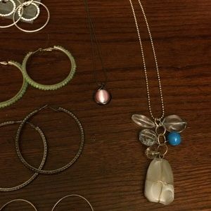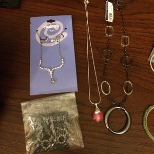 Fashion forward jewelry for every occasion. 1 silver necklace with pink stone. 1 gun metal with pink stone. 1 silver necklace with jewels and rock. 1 diamond like necklace from Clair's. 1 gun metal New York and company necklace. 1 diamond dangle earrings from white and black. 1 diamond hoop earrings, 1 bead like mint earring. 1 red diamond hoops. 1 plain silver pair. All costume jewelry. Some new with tags other gently used