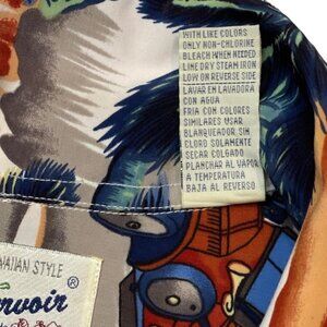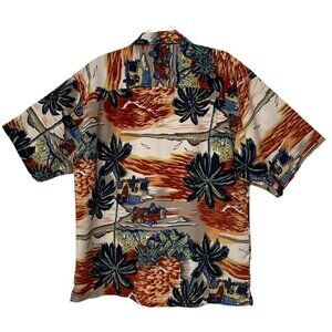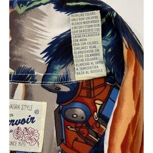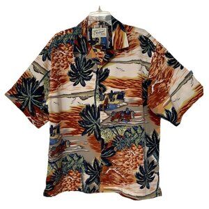 RESERVOIR HAWAIIAN STYLE ~ Men's button front leisure shirt. Size Large. Short sleeves. Collar. Multicolor: rust, copper, white, navy, green, black, salmon, cobalt, olive. Palm trees, beach, island themed pattern. Beautifully designed, thick silky fabric. Super nice.