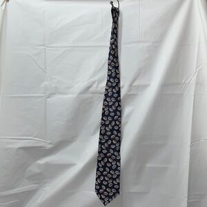 Resilio Tie Blue Base Geometric shapes worn tan blue and coral 58” L 4” W. 100% imported silk.