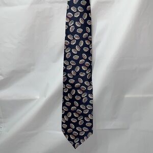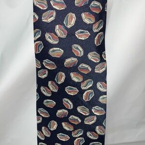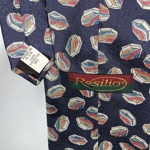 RESILIO Tie Blue Base Silk Geometric shapes worn tan blue and coral 58” L 4” W