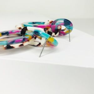 Colorful flattened marbled acrylic rings intertwine on these earrings for a fresh, stunning style. Features pink, yellow, navy, turquoise, white and brown. Push back closure.