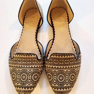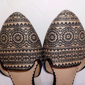 Great tan and black slip on flats. They do have a slight lift in the back less than an inch. Open sides for a fun fit and flare chic look. The patten is classically unique! These shoes are practically new! No real signs of wear. From a smoke free home. Fast shipping.