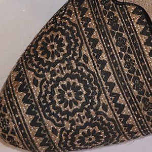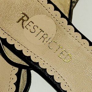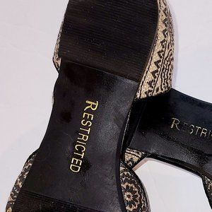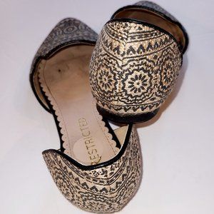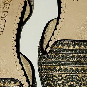 Women's Restricted Flats Gold and Black Slip on with Chunky Flat Heel. Size 6.