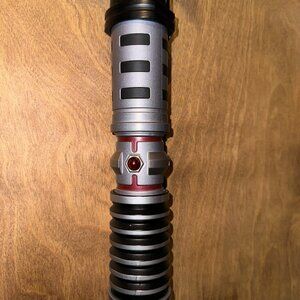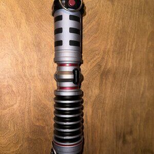 This saber features a flat-top emitter featuring two built-in, decorative buttons and a D-ring resembling the D-ring near the top of the Darth Vader lightsaber. It is predominantly black.