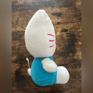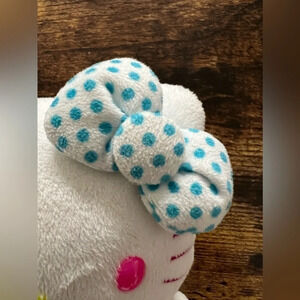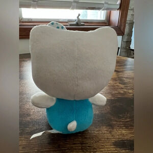 Small Hello Kitty plushie/plush/stuffed animal. Hello Kitty is wearing a teal blue outfit and has a teal blue & white bow. The pink eyes and yellow nose are plastic. Very good, used condition from 2014.