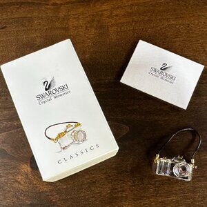 This retired Swarovski Crystal Memories camera mini figurine features 18K gold-plated metal details. It is part of the "In a Class of Their Own" collection. It stands approximately 1 1/16 inches (around 2.8 cm) in height.