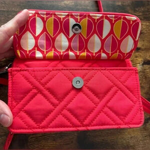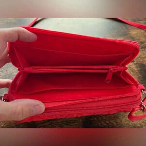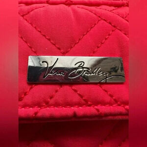 Vera Bradley mini- quilted, solid red crossbody purse. The front has a traditional silver metal Vera Bradley logo plate, on the front flap, snap closure pocket. The middle folds open, has 8- card holder slots + 1- plastic ID holder spot. 4- slide in pickers and 1- large bill area, all closed by a zipper. The back has 4- slide in pocket areas, and 1- zippered closure coin pocket, which all is closed by a zipper. 1/4” wide, fully adjustable strap. Very hood, used condition.