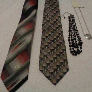 RETRO 2 TIES & 2 NECKLACES 1 RETRO & 1 NEW LOT. THIS IS SUCH A GREAT LOT. WE DO NOT BREAK UP LOTS NOR BUNDLES. STRIPES TIE IS BY EUGENE JACOBS BY OLEG CASSINI. AND THE GREYISH TIE STAFFORD. BOTH WITH LIGHT WEAR. NEW METAL B NECKLACE. AND EDWARDIAN STYLED RETRO NECKLACE WITH SOME WEAR. ENJOY THE GOODIES. 5TH GROUP. #246. THANKS