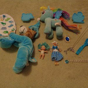 THIS IS SUCH A FUN LOT. WE DO NOT BREAK UP LOTS NOR BUNDLES. MOST ITEMS ARE VINTAGE SOME MORE THAN OTHERS. MOST ITEMS HAVE WEAR SOME MORE THAN OTHERS. SOMETIMES THERE IS A SCENT OF STORAGE SOME MORE THAN OTHERS. OF NOTE : CUTE SLEEPY BEAR HONG KONG. VINTAGE DOLL TINY DOLL AND BLUE GLITTER HAIRED BABY DOLL.TY SPARKLE RAINBOW PONY. BLUE CHICK & EGG COOKIE CUTTER. BARBIE OR FRIENDS LITTLE SHIRT. TINY DOLL MUG. TAURUS SYMBOW NECKLACE. BLUE PLASTIC GEM TO REDO. PRETTY NECKLACE DOLL DOLPIN MISSING SOME STONES. BABY HAT. ENJOY THE LOT. 3RD GROUP. #554. THANKS