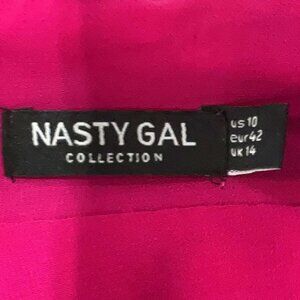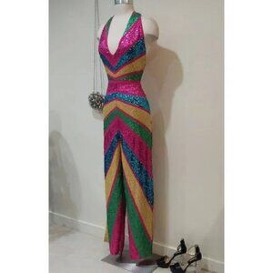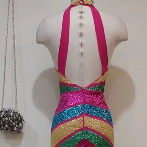 MUST HAVE! An absolutely STUNNING, chic, and sexy dancing queen jumpsuit! Inspired by the disco fever era, it's one of those bold, high-fashion items that create an instant drama. It comes in vibrant colorblocking Fuchsia, Yellow, Green, and Blue sparkling sequins that look amazing in any light. Futuring flattering fitted bodice with sexy deep V neckline and statement low back, zip fastening and button closure on the back of the neck, flowy wide-leg pants, and soft full chiffon lining in Fuchsia/ Pink. This striking piece looks and photographs very well from any angle and will be perfect for any occasion or photoshoot. Make the most of this stunner by teaming it with a sleek up-do, statement earrings, a mini clutch, and platform (strappy) sandals. Made from high-quality non-stretchy 100% Polyester. Size 10 US. The original price is $284. Excellent condition. Comes from a clean, smoke-free home.