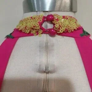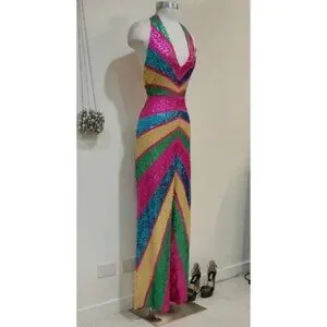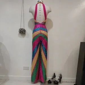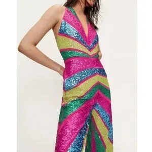 MUST HAVE! An absolutely STUNNING, chic, and sexy dancing queen jumpsuit! Inspired by the disco fever era, it's one of those bold, high-fashion items that create an instant drama. It comes in vibrant colorblocking Fuchsia, Yellow, Green, and Blue sparkling sequins that look amazing in any light. Futuring flattering fitted bodice with sexy deep V neckline and statement low back, zip fastening and button closure on the back of the neck, flowy wide-leg pants, and soft full chiffon lining in Fuchsia/ Pink. This striking piece looks and photographs very well from any angle and will be perfect for any occasion or photoshoot. Make the most of this stunner by teaming it with a sleek up-do, statement earrings, a mini clutch, and platform (strappy) sandals. Made from high-quality non-stretchy 100% Polyester. Size 10 US. The original price is $284. Excellent condition. Comes from a clean, smoke-free home.