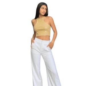 Neutral never has to mean boring—just look at Retrofete's Audra Top. This nude racer crop top features all-over vertical sequins that reflect the light creating an almost liquid effect. Wear it with our Julien Pant for a shimmery co-ord look. Shown here in Nude.