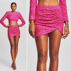 Crafted with scores of hand-stitched pink sequins, the Celestia Skirt glistens at every turn. The mini body-conscious silhouette features an asymmetrical hem, delicate ruched detailing down the side and an invisible side zip closure. Toughen it up with a graphic tee or pair it with your favorite bodysuit for a bold nighttime look.