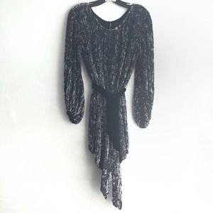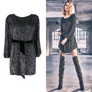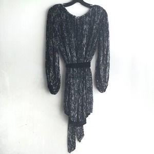 Hand-applied iridescent sequins completely cover Retrofête's Grace mini dress with decadent disco-era style, including boatneck, long sleeves and belted waist. Elasticized cuffs. Split back with button-and-loop closure. Designed for a slightly loose fit. Weighted, heavily embellished, non-stretchy fabric. Approx. 19” pit to pit and 31” from center back to hem.