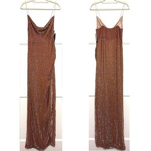 RETROFETE Hand Stitched Copper Sequin Draped Sleeveless Ruched Side Slit Gown M