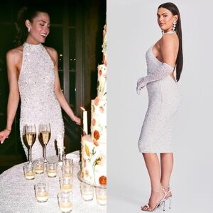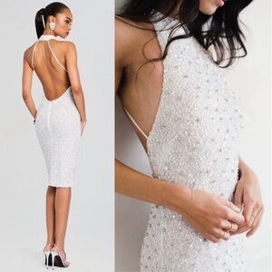 RETROFETE Hand Stitched Crystal & Sequin Sleeveless Halter Open Back Dress XXS