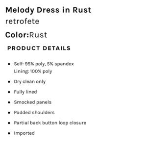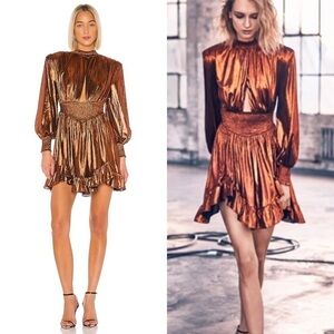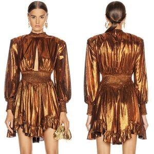 RETROFETE MELODY RUST METALLIC LONG BISHOP SLEEVE SMOCKED DISCO PARTY DRESS