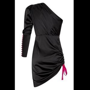 Look absolutely chic and classy at event parties in this gorgeous mini cocktail dress! Cut with a slim fit, it has: ruching on one side, a one-shoulder asymmetrical sleeve, contrast pink buttons on the sleeve cuff, contrast pink ribbon 🎀 tie on the side and a hidden zipper on the side. This dress is also unlined.