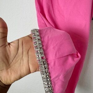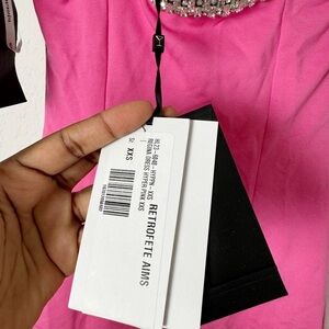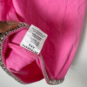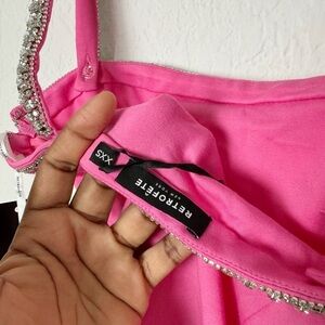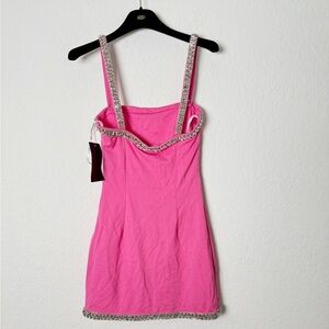 This minimalistic staple is crafted with a square-neckline with crystal trim, which also runs along the hemline. Prepare to turn heads. Shown here in Hyper Pink.
