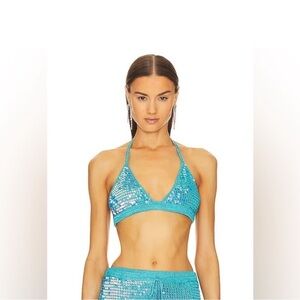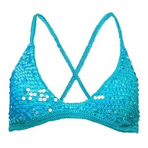 The Leandra Crochet Bra is a bralette version of our bestselling Molly Top. Crafted with delicate crochet and statement sequins, it's perfect for your next warm-weather escape. Shown here in Aqua Blue.