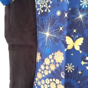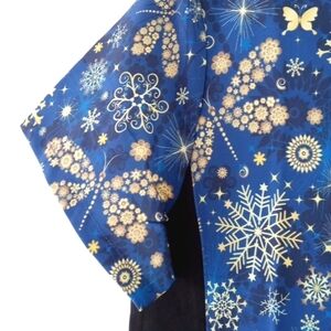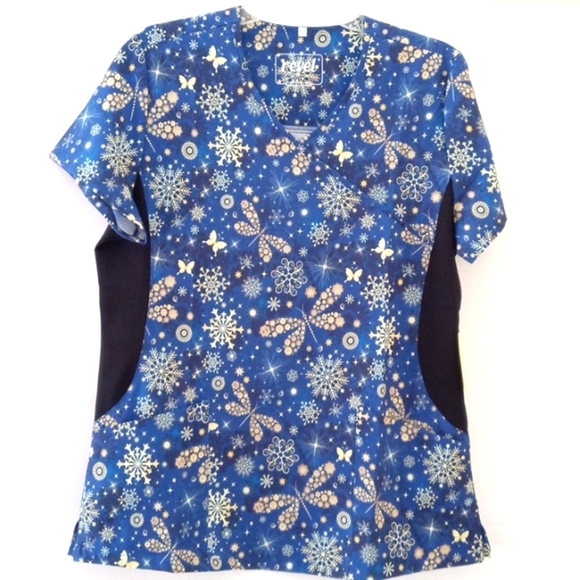REVEL MEDICAL SCRUB TOP Navy Blue Gold Butterflies Premium Stretch Short Sleeve V-Neck 2 Pocket Medical Office Scrub Top Dental Office Uniform Work Shirt SIZE Large NWT