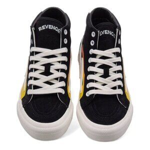 The product is a brand new pair of Revenge X Storm high top sneakers in black with a flame design. These sneakers are designed for men in a US size 8. The style of the shoes is a combination of a sneaker and athletic shoe, featuring a high top shaft style. Made with authentic materials, these sneakers are part of the VANS Old Skool product line, offering a unique and stylish option for those looking to make a statement with their footwear.