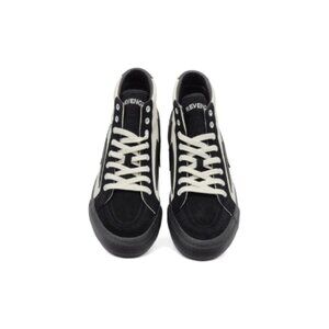 The REVENGE x STORM High Top Vol. 2 in white and black is a new, rare sneaker featuring a lightning bolt design. This athletic shoe is designed for men in size 9, with a lace-up closure and high-top shoe shaft style. It is suitable for various occasions including activewear, casual, and workwear, while also featuring comfort and reflective properties. The sneaker is vintage and released in 2017, with a rubber outsole and canvas lining material. The colorful and classic design makes it a standout choice for those seeking a unique and stylish footwear option.