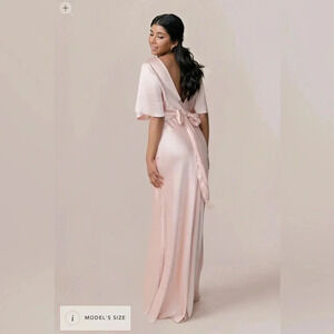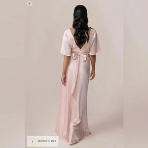 Indulge in the Maya Satin dress, crafted with a relaxed flowing fit and modern design, this dress exudes a whimsical feeling that is perfect for your big day! Maya features an empire waistline with a dainty seam detail framing the bust, oversized flutter sleeves, a low v-back, and a self-tie satin sash to create a bow in the back.