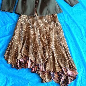 Paisley on one side and an olive print on the other, this reversible, asymmetrical skirt is, first of all, gorgeous. And secondly, it is a two-in-one great value. Size medium. Polyester fabric.