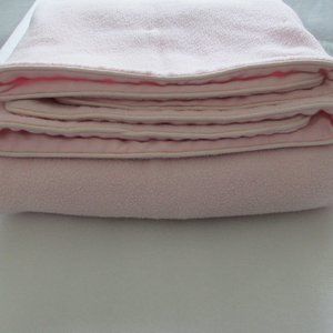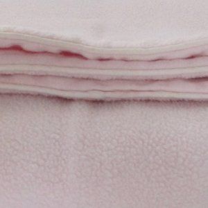 Big enough for play or a toddler bed, this quilt has pink cotton knit on one side, plush pink sherpa fleece on the other, with a pink corded edge.
