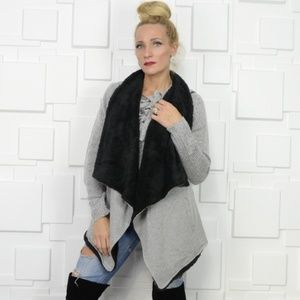 GRAB THIS CAUSALLY COMFORTABLE REVERSIBLE waterfall front VEST FOR THE SEASON! ONE Side is gray material, the other side is black faux fur. Gray side has pockets.