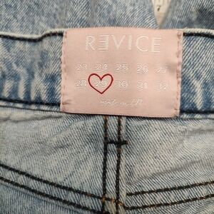 These Revice Women's Jean Shorts in size 29 are a stylish addition to any wardrobe. The light wash and high-rise cut-off style give a trendy and casual look, perfect for summer, fall, and spring occasions. Made of comfortable cotton denim, these shorts feature a 5-pocket design, zip closure, and belt loops for added convenience. The blue color and solid pattern make them versatile for various outfits, while the 7-inch inseam length offers a flattering fit. Perfect for a day out or a beach vacation, these shorts are easy to care for with machine washable fabric. Refer to photos for measurements