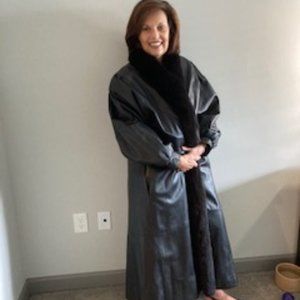 HIGH STYLE, FULL LENGTH LEATHER WITH FAUX FUR TUXEDO. INCLUDES REMOVABLE SNAP IN FAUX FUR LINING. FULL SLEEVES WITH NARROWED CUFF. VINTAGE LOOKS NEW