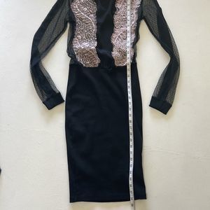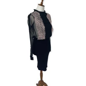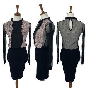 REVISE Unique black Sheer pink Lace side boob Sexy long sleeved ribbed small