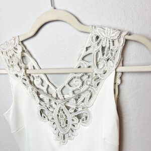 REVOLVE BRAND DRESS THE POPULATION Pearl White Cocktail Mini Dress Size XS. This is a beautifully soft, sleeveless dress that could easily be for many occasions, wedding, prom, social night out. This has a gorgeous lace detailing at front and a low back lace detail as well. The bottom hem has lace detailing at the sides. This is in excellent pre owned condition with no flaws.