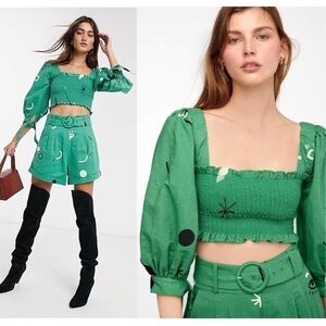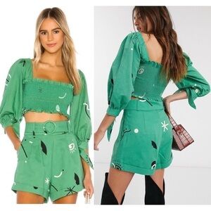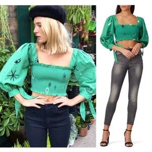 REVOLVE CAPULET Puff Sleeve Graphic Print Square Neck Ruffle Smocked Crop Top S