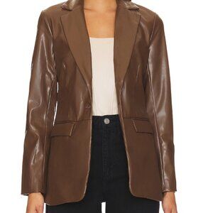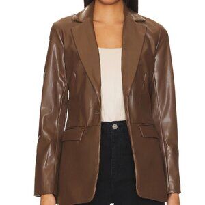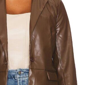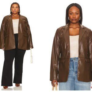 Self: 100% polyurethane.Backing & Lining: 100% polyester. Made in China. Hand wash. Singular front button closure. Front flap pockets. Button cuffs. Lightweight faux leather fabric. Model 1: Height 5'10", Waist 32", Bust 40", Hips 42".Size L.Bust measures approx 34" around.Hem measures approx 47" around. Model 2: Height 5'9", Waist 24", Bust 32", Hips 34".Size XS.Bust measures approx 34" around.Hem measures approx 39" around. Model 3: Height 5'9", Waist 35", Bust 44.5", Hips 50".Size 1x.Bust measures approx 40" around.Hem measures approx 51" around. Model 4: Height 5'10", Waist 41", Bust 38", Hips 55".Size 3x.Bust measures approx 49" around.Hem measures approx 60" around. Revolve Style No. REMX-WO30, REMX-WO32. Manufacturer Style No. REOW4 F22ES.