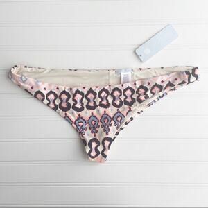 This cheeky swimsuit bottom features a vibrant Aztec boho print in a playful mix of pink, blue, black, and cream.