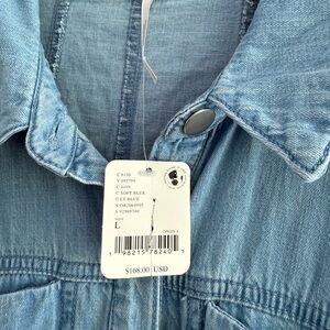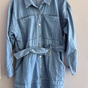 Stylish Free People (Revolve) chambray lightweight elevated denim chambray button-up dress with a matching belt. Perfect for Fall- brunch lunch football and tailgating! Features long sleeves and front pockets. Comfy. New With Tags. Large
